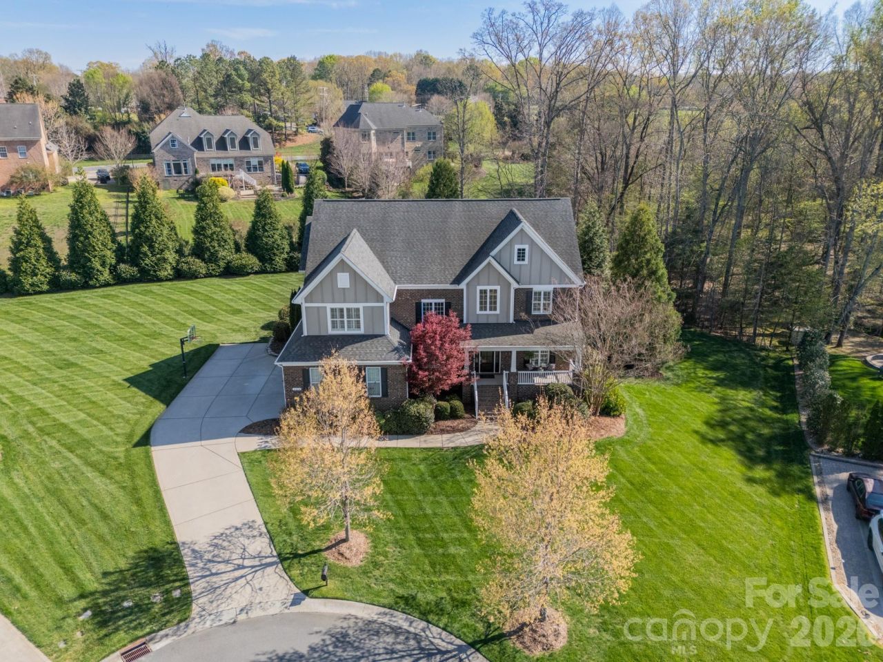 A rare offering that impresses at every turn, this exceptional home is perfectly positioned on a premium cul-de-sac homesite, one of the largest in the Estates enclave of Hollister, a sought-after, amenity-rich community. Enjoy an unparalleled lifestyle with access to a clubhouse, resort-style pool, tennis and sport courts, and scenic nature trails, all just moments from top-performing Weddington schools. Striking full brick architecture and a welcoming rocking chair front porch set the stage for what lies within. A dramatic two-story foyer and dining room, enhanced by designer lighting, create an unforgettable first impression. Thoughtfully curated interiors feature highly upgraded prefinished hardwood flooring, new carpet, fresh paint, and extensive crown molding and architectural trim throughout. Designed for both everyday living and elevated entertaining, the chef's kitchen showcases a large center island with designer-edge granite countertops, a gas range with hood, glass rinser, and an abundance of upgraded cabinetry. A private study with French doors and custom built-ins offers a refined workspace, while a main-level guest bedroom and bath provides comfort and flexibility. The owner's retreat is a true sanctuary, offering generous space for seating, a custom closet system, and a spa-like bath with dual vanities, framed mirrors, and elegant tile and mosaic accents. Secondary bedrooms are well-appointed, including an ensuite, along with a spacious bonus room ideal for recreation or relaxation. Exceptional functionality continues with dual laundry areas, including a main-level laundry/mudroom with cabinetry, sink, and exterior access, plus an upstairs laundry for added convenience. Outdoor living is equally impressive with a covered rear porch overlooking a large, private backyard framed by mature evergreens, premium landscaping, fragrant blooms, and full yard irrigation. A storage shed adds practicality for outdoor needs. The climate-controlled three-car garage, enhanced with spray foam insulation, offers the perfect space for car enthusiasts, hobbies, or workshop use. All of this in a prime location with convenient access to shopping, dining, and major employment centers?an extraordinary opportunity to experience refined living in one of the area's most desirable communities.